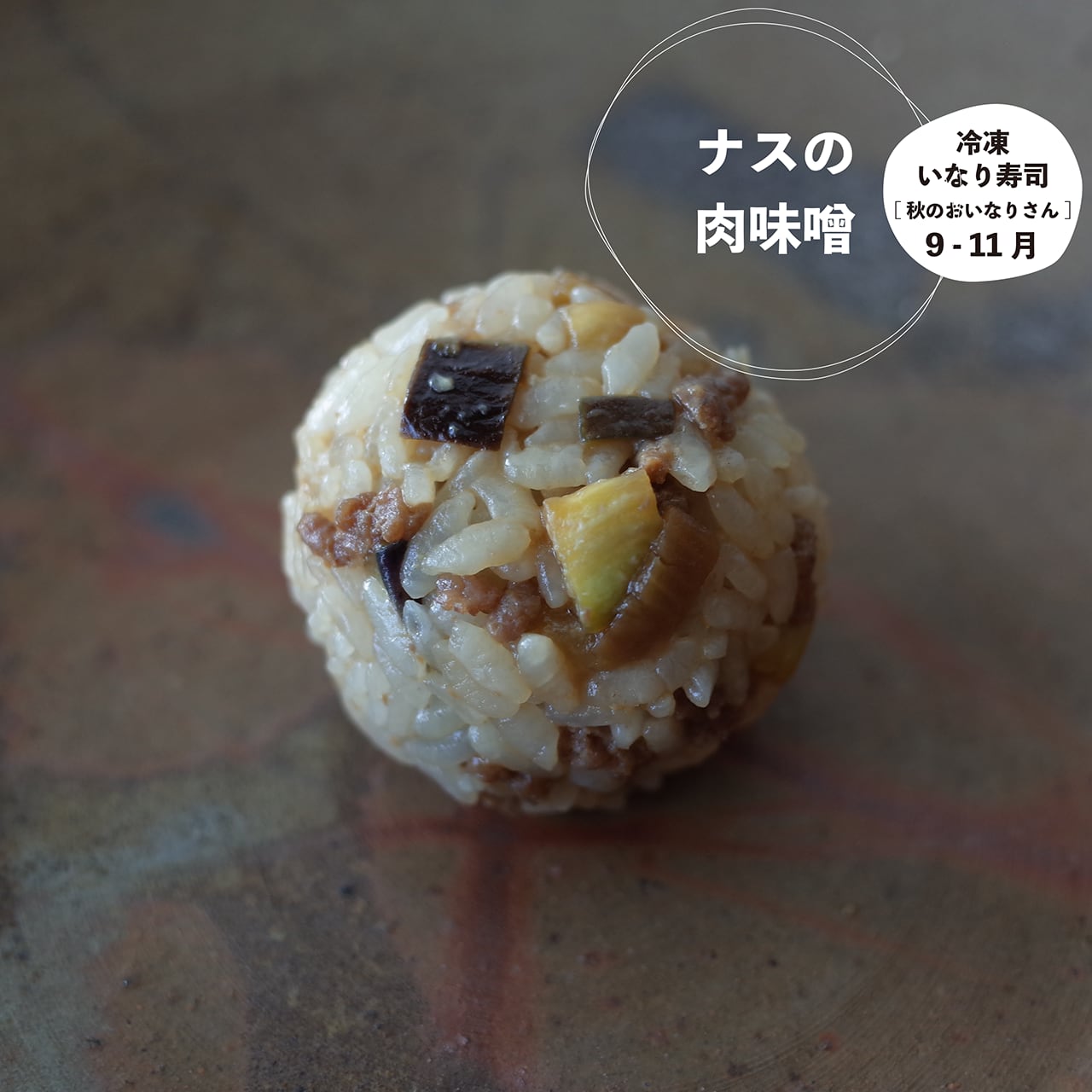 ナスの優しい旨味と、肉味噌のコクが絶妙に調和。ボリュームたっぷりのいなり寿司。味噌は自然栽培玄米麹と有機栽培の大豆で1年半熟成させたものを使用しています。